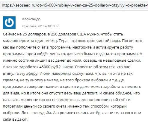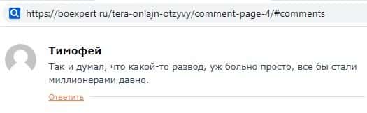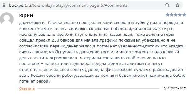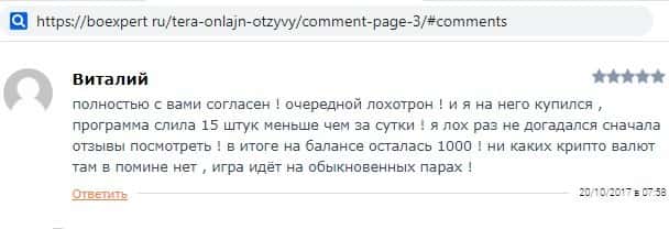 Трейдер в своем отзыве на сайте boexpert ru называет трейдинг с компанией Тера Онлайн Ко разводом для лохов и призывает внимательно выбирать партнеров.