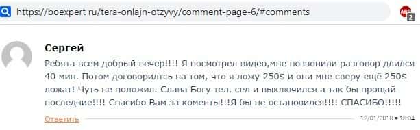 Трейдер, просмотревший рекламный видеоролик о Тера Онлайн Ко, рассказывает в своем отзыве, что после этого начались звонки от мошенников и он чуть не лишился денег.