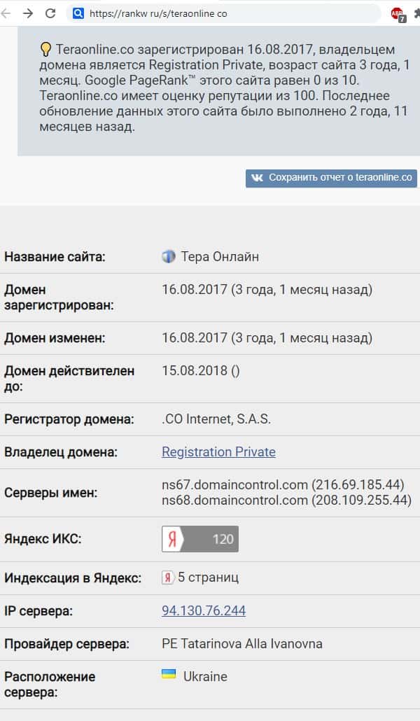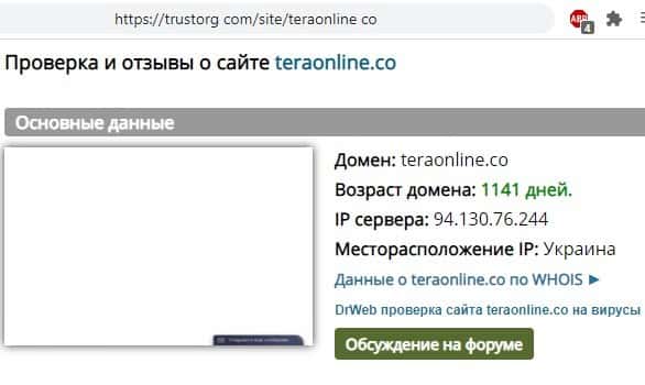 Проверка доменного имени аферистов TeraOnline Co на сервисе trustorg com показала, что возраст домена к моменту написания статьи составляет 1141 день, регистрация на Украине.