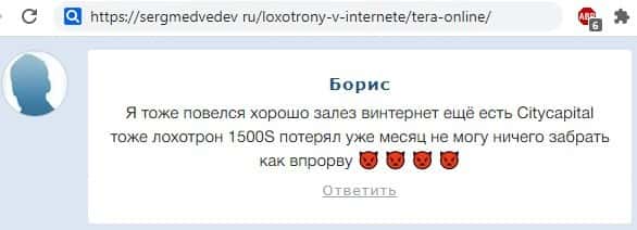Обманутый клиент компании Тера Онлайн Ко в своем отзыве сообщает, что он потерял в этом лохотроне полторы тысячи долларов за месяц, не смог вывести.