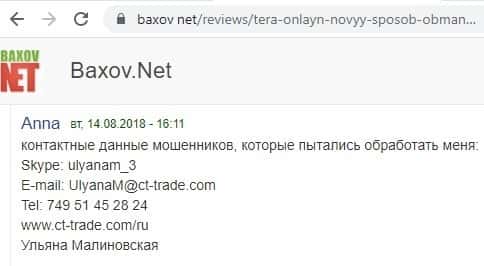 Удалось найти только один контактный номер телефона в отзыве клиента мошеннической компании Тера Онлайн Ко на сайте baxov net: