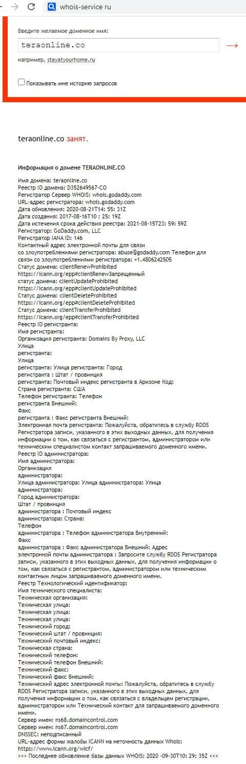 - Проверка информации о владельце доменного имени сайта TeraOnline Co