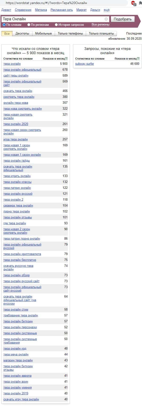 Количество запросов по бренду "Тера Онлайн" в Яндекс Вордстат выявлено 5900 случаев. Неплохой показатель популярности, но он во многом связан с одноименным игровым сайтом.