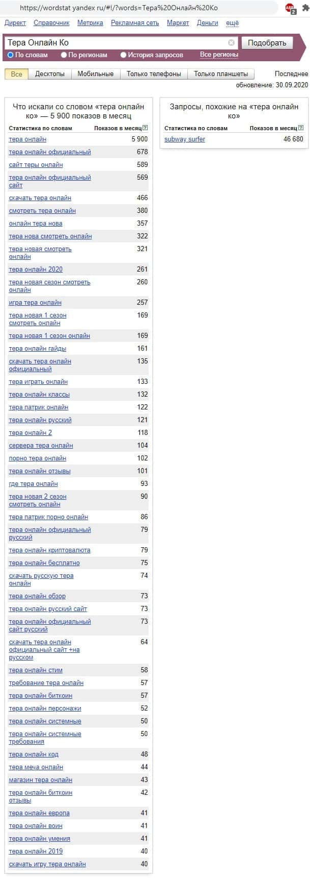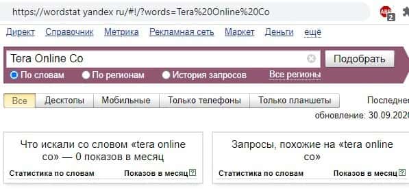 Количество запросов по бренду "Тера Онлайн Ко" в Яндекс Вордстат выявлено 5900 случаев. Хороший показатель, но он во многом связан с одноименным игровым сайтом.