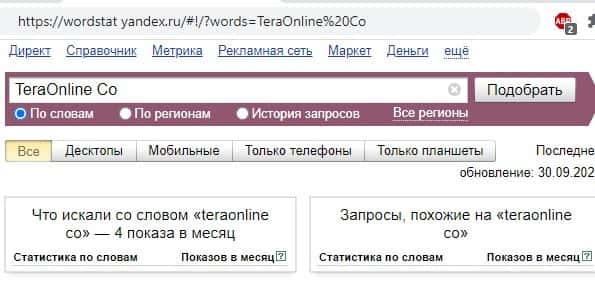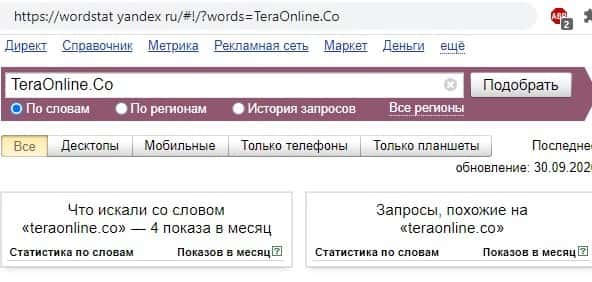 Поисковых запросов по англоязычному бренду "TeraOnline.Co" без пробела с точкой на сайте Яндекс Вордстат выявлено 4 случая в месяц, маловато будет.