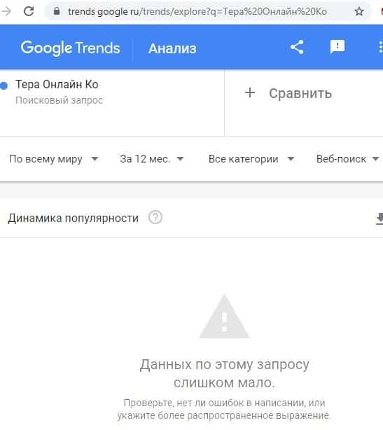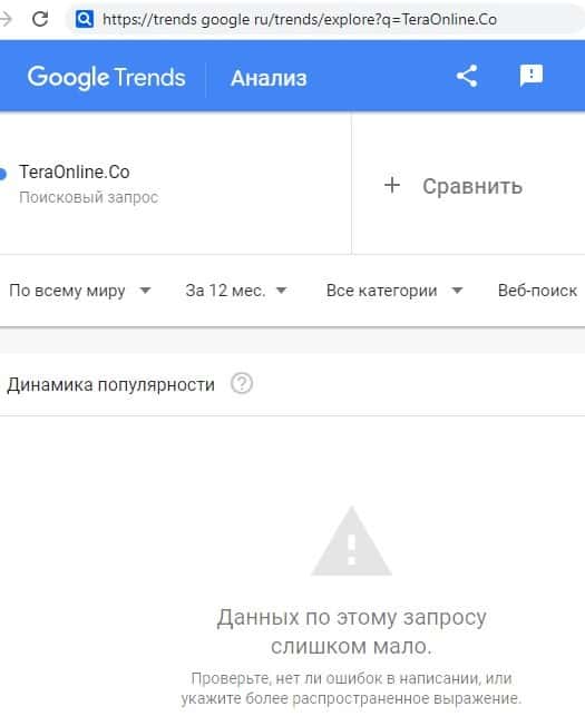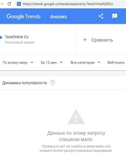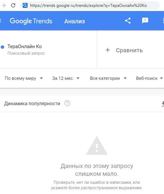 Поисковых запросов по русскоязычному бренду "Тера Онлайн Ко" с пробелом на сайте trends google ru не выявлено, или слишком мало данных.