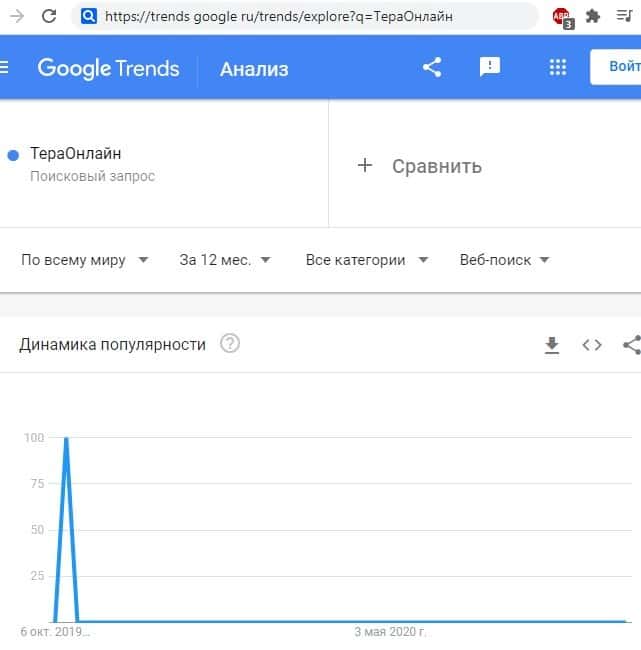 Статистика запросов на Гугл Трендс по бренду ТераОнлайн без пробела показывает, что в октябре 2019 года количество просмотров достигло максимума, но с тех пор оставалось на нуле.