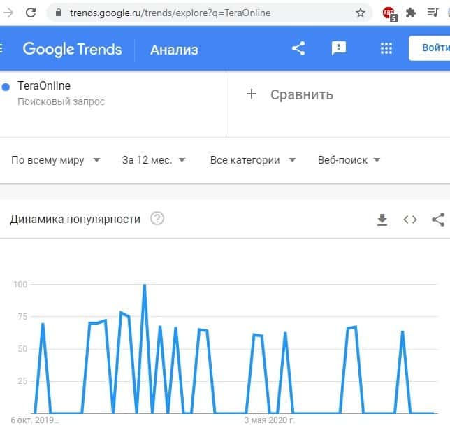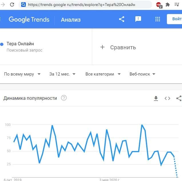 Статистика запросов на Гугл Трендс по бренду Tera Online с пробелом показывает, что за последние полгода популярность бренда снизилась до 50 процентов.