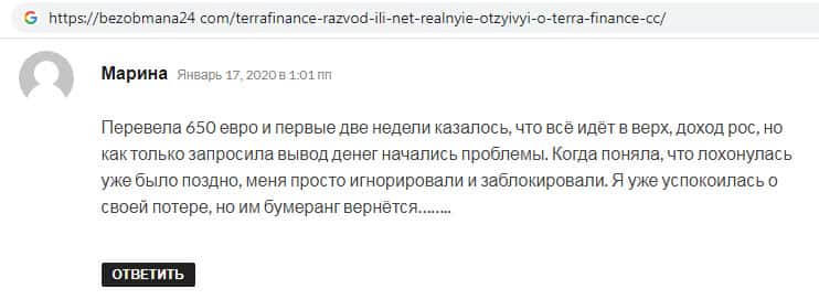 На веб-портале bezobmana24 com найден отзыв некой Марины о том как она перевела на сайт аферистов Терра Финанс 650 евро. В течении двух недель казалось будто доход растет, но когда автор отзыва отправила запрос на вывод средств сразу же начались проблемы. Мошенники TerraFinance Co заблокировали клиента и забрали все деньги себе.