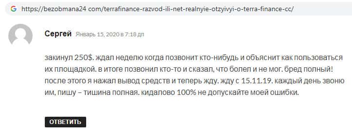 На веб-площадке бородатыйвопрос ком был замечен пользовательский отзыв о работе сайта аферистов Терра Финанс. Сайт мошенников TerraFinance Co работает крайне плохо. Сбои случаются нередко, так же имеются определенные проблемы с обратной связью на сайте. Поэтому нет никакой гарантии того, получите ли Вы выплаты с их стороны.