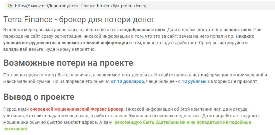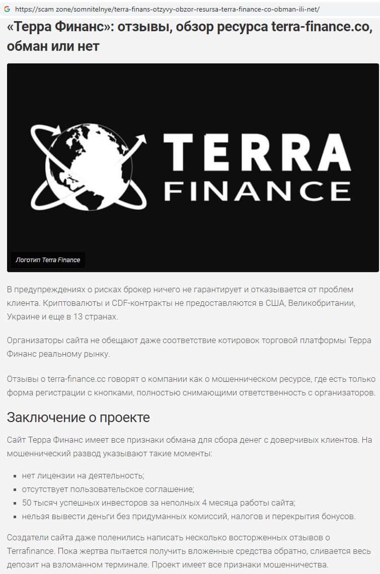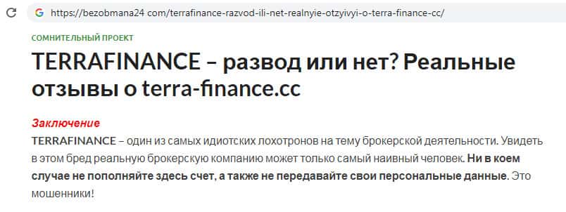На сайте bezobmana24 com обнаружена статья о жульническом проекте Терра Финанс. По мнению автора статьи предоставленной ниже на скриншоте, TerraFinance Co - один из самых нелепых интернет-лохотронов на тему брокерской деятельности. Ни в коем случае на сайте жуликов нельзя пополнять торговый счет и регистрироваться на сайте !!!