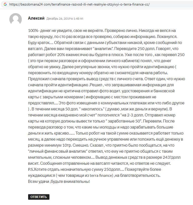 На веб-сайте bezobmana24 com обнаружен отзыва некого Алексея, который утверждает о том, что деньги на мошенническом сайте TerraFinance Co вывести точно не получится. Система вывода денежных средств работает в течении первого месяца после регистрации, после чего чаще всего шуллера Терра Финанс блокируют торговый счет.