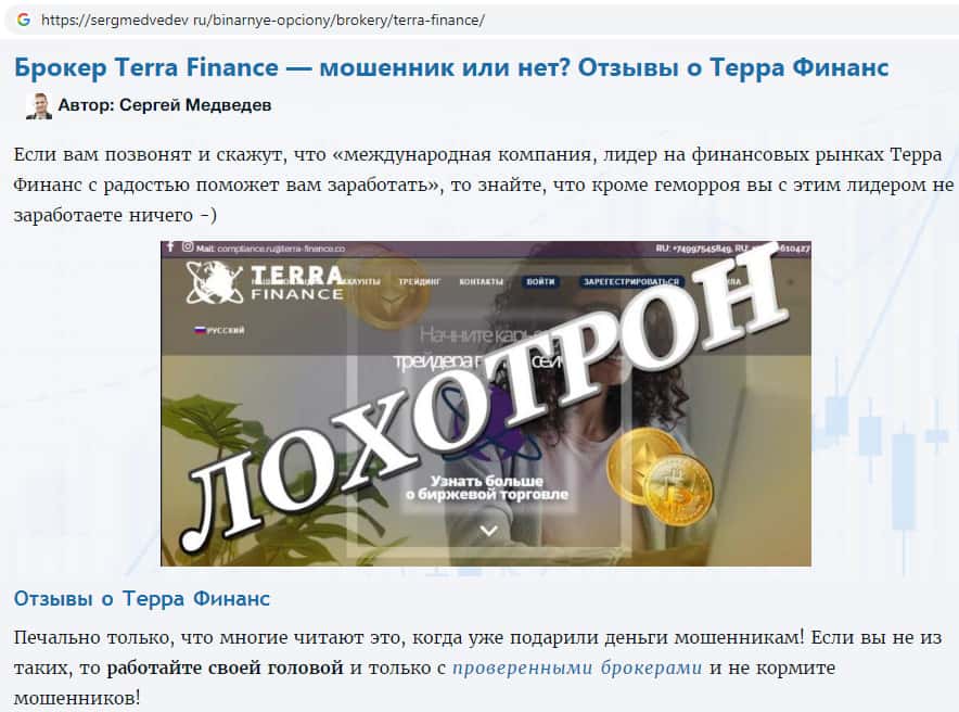 На сайте sergmedvedev ru обнаружена информация о том, что мошенники Терра Финанс названивают людям, вешая лапшу на уши о том, что якобы являются международной брокерской компанией. Здесь прежде всего необходимо задуматься о том, откуда у шуллеров TerraFinance Co есть Ваш номер телефона и почему они звонят именно Вам.