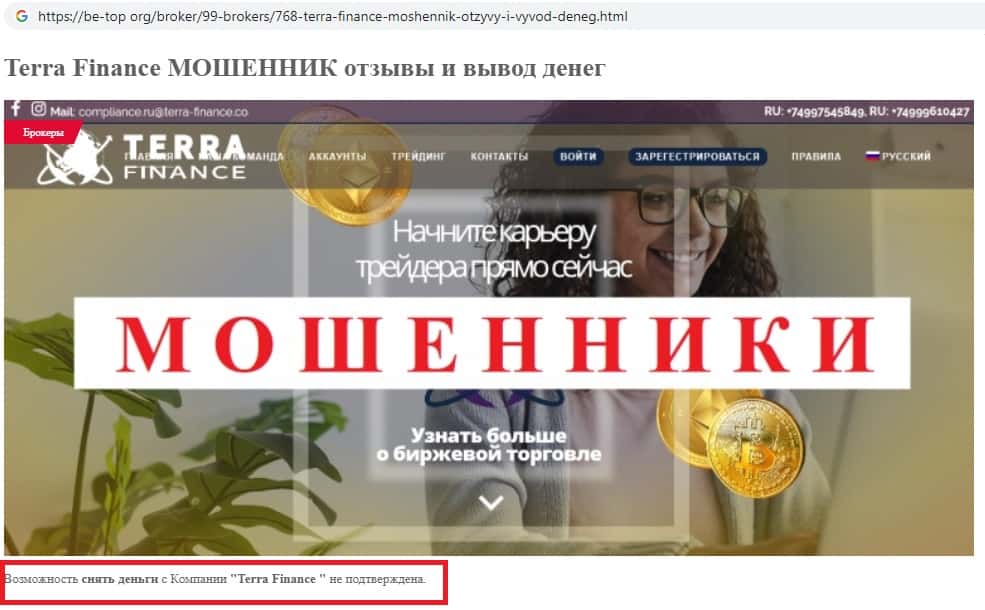 На веб-сайте be-top org замечена информация о мошенническом проекте TerraFinance Co, а именно о том, что возможность снять деньги с торгового счета на сайте скам-компании Терра Финанс не подтверждена. Не связывайтесь с данной жульнической конторой !!!