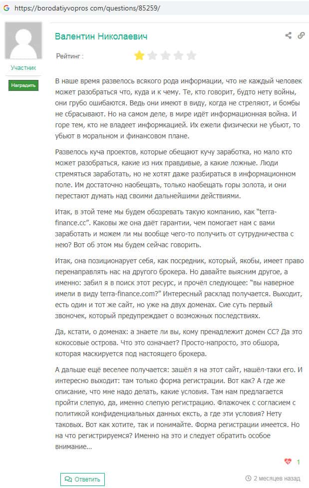 На веб-портале borodatiyvopros com отыскан отзыв о скам-проекте TerraFinance Co. Автор отзыва предупреждает о том, что обещания данной конторы о высоком заработке так и остаются обещаниями, а пользователь в итоге остается ни с чем и чаще всего с кредитом взятым у скам-компании Терра Финанс на свое имя.