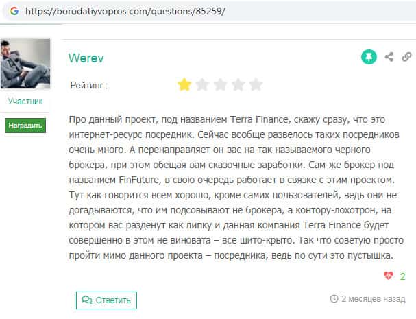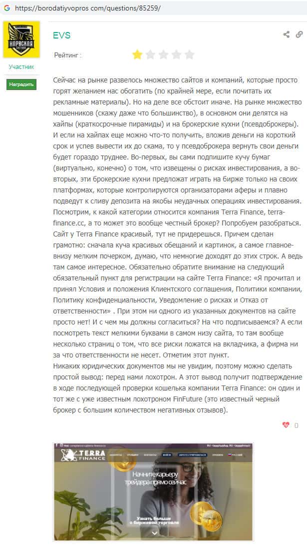 На веб-сайте бородатыйвопрос ком найден отзыв о скам-брокере Терра Финанс, которая очень похожа на множество брокерских интернет-лохотронов. Такие скам-организации как правило занимаются сбором денежных средств у доверчивых клиентов, после чего закрывают свою контору.