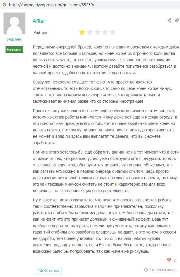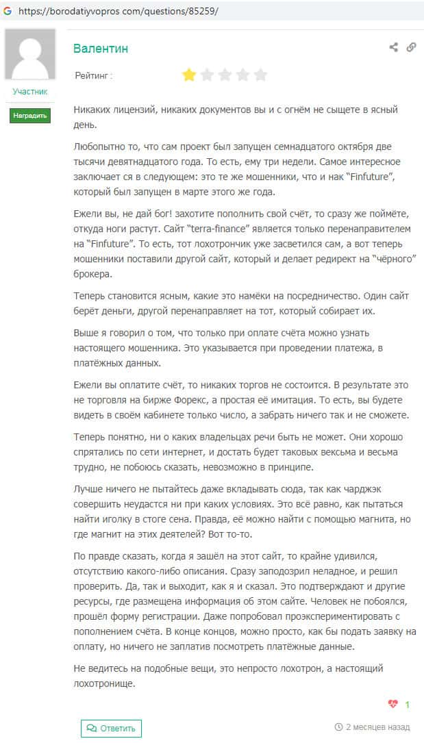 На веб-портале borodatiyvopros com так же был замечен пользовательский отзыв, автор которого некий Валентин пишет о том, что у брокерской конторы TerraFinance Co нет лицензии на брокерскую деятельность. Скам-проект Терра Финанс запущен недавно и вероятнее всего скоро закроется !!!
