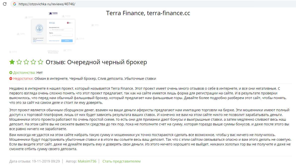 На сайте-отзовике otzovichka ru отыскан пользовательский отзыв о скам-брокере Терра Финанс. Данная мошенническая организация занимается тем, что заманивает людей на свой фальшивый сайт якобы выгодными предложениями, после чего возможно делает первую выплату и сливает все деньги с торгового счета.