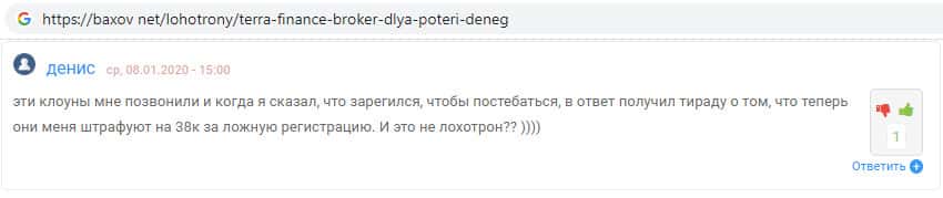 На веб-сайте баксов нет найден отзыв некого Дениса, который пишет, что решил пошутить над мошенниками Терра Финанс и зарегистрировался на их сайте просто так. После такой шуточки аферисты TerraFinance Co стали ему навязчиво названивать и угрожать каким-то штрафом за ложную регистрацию.