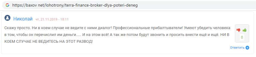 На веб-ресурсе baxov net обнаружен комментарий некого Николая, который предупреждает о том, что с аферистами TerraFinance Co вести диалог нельзя. По той причине, что шуллера умеют убеждать человека. Автор данного отзыва попал под влияние мошенников Терра Финанс и отправил им свои деньги.