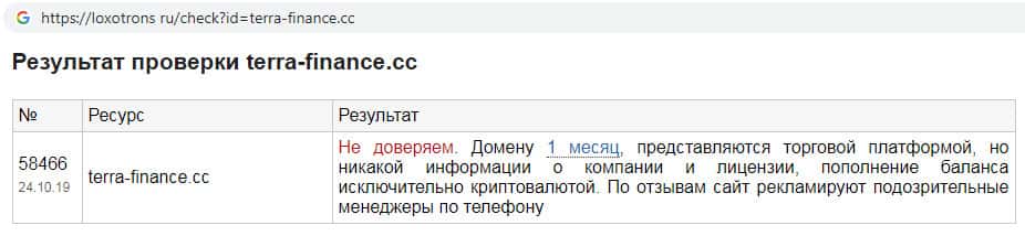 На интернет-портале loxotrons ru была произведена проверка сайта скам-конторы TerraFinance Co на мошенничество. Домен данной шараги был зарегистрирован относительно недавно. Никакой информации о лицензии на сайте аферистов Терра Финанс нет, а пополнение баланса исключительно криптовалютой.
