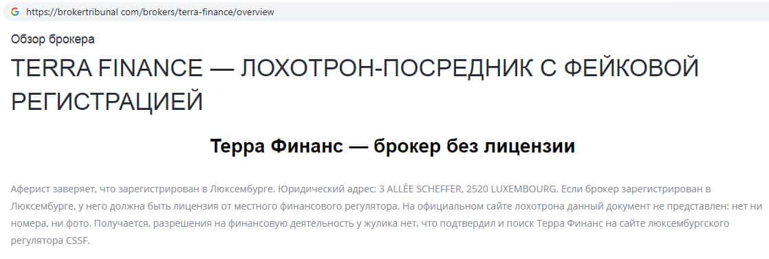 На информационном сайте brokertribunal com была найдена информация о скам-организации Терра Финанс. Мошенники на своем официальном сайте утверждают, что контора зарегистрирована в Люксембурге, но на самом деле в документации компании нет ни регистрационного номера ни самой лицензии.