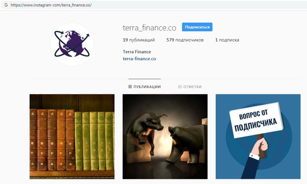 Так же у мошеннической организации TerraFinance Co имеется аккаунт в instagram com, где они размещают очень много рекламы о своей конторе. Жулики Терра Финанс здесь так же разместили ссылку на свой сайт и рекомендуют торговать на их сайте. Никакой сещуственной информации о брокерской конторе здесь не замечено.
