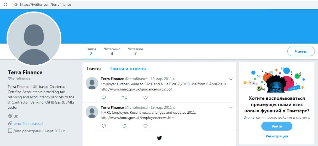 Мошенники Терра Финанс так же зарегистрировались на сайте twitter com с целью привлечения пользователей Твиттера в свою жульническую контору. Кроме ссылки на их фальшивый сайт никакой информации о компании на данной странице найти невозможно. Связываться с аферистами TerraFinance Co не стоит !!!