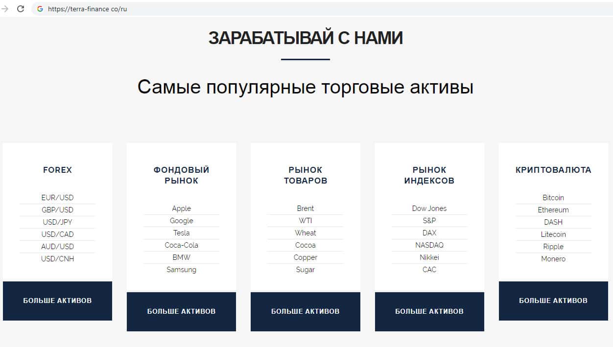 Типы торговых активов на официальном интернет-ресурсе шуллеров TerraFinance Co