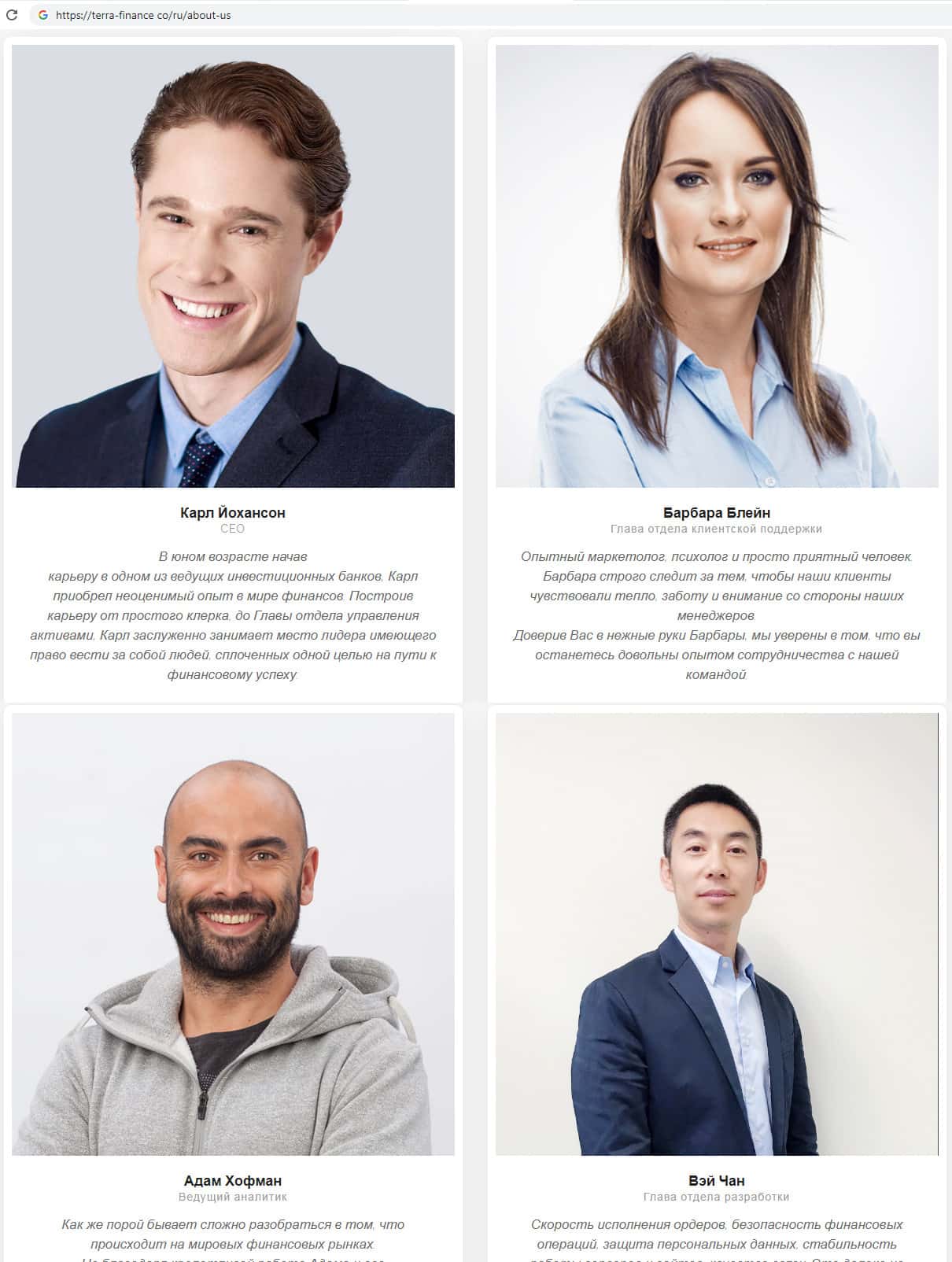 Брокерская контора TerraFinance Co на своем официальном сайте указывает информацию о том, что их команда состоит из 4-х человек. Вероятнее всего предоставленные фотографии на сайте аферистов Терра Финанс липовые. Данная скам-организация не вызывает доверия, с данной шарагой связываться не стоит !!!