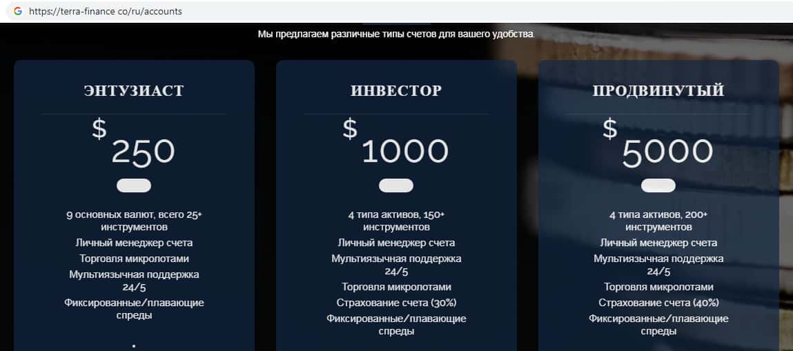 - Виды аккаунтов предлагаемых на веб-ресурсе шуллеров TerraFinance Co