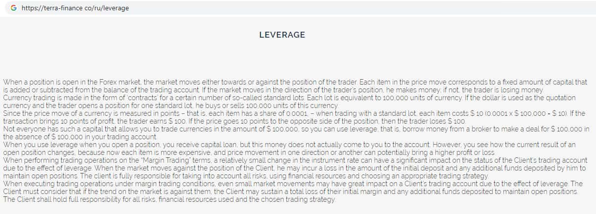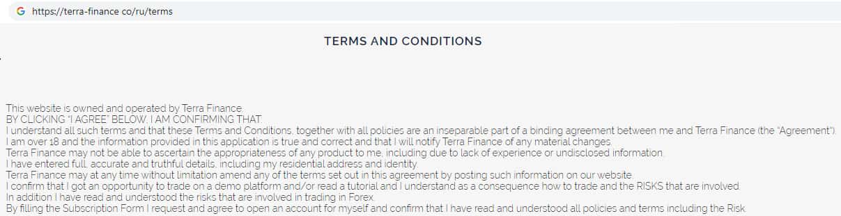 Мошенники TerraFinance Co на своем официальном сайте оставили пользователю всю необходимую информацию об условиях пользования сайтом и предлагаемой торговой платформой. Все необходимые документы на сайте лохотрона Терра Финанс полностью на английском языке, поскольку сайт не рассчитан на русскоязычных пользователей.