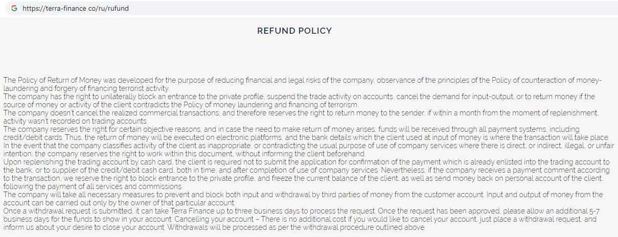 Учитывая то, что вся документация на сайте скам-брокера Терра Финанс полностью на английском языке велик риск того, что мошенники начнут выманивать Ваши денежные средства ссылаясь на некие пункты в клиентском соглашении. Торговля на фальшивом сайте конторы TerraFinance Co является небезопасной !!!