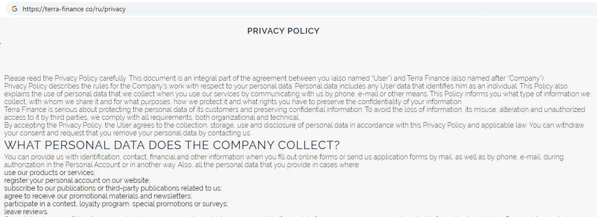 Политика конфиденциальности мошеннической организации Терра Финанс