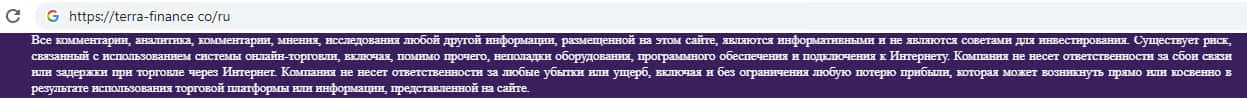 Отказ от ответственности на сайте скам-брокерской конторы TerraFinance Co