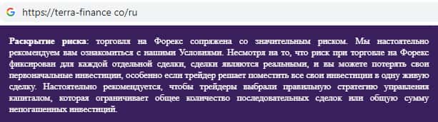 В уведомлении о рисках жульническая организация TerraFinance Co указывает о том, что торговля на сайте сопряжена определенным уровнем риска. Соответственно данная брокерская компания не несет никакой ответственности за деньги утраченные клиентом на их фальшивом сайте. В данном случае шулера ссылаются на ошибочный выбор торговой стратегии клиента.