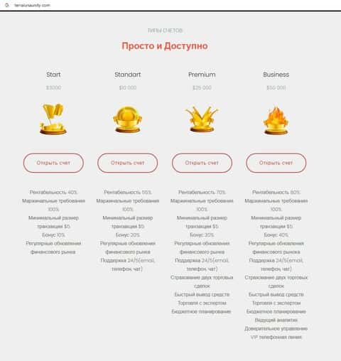 - Типы торгового счета на интернет-сервисе мошенников Terra Luna Unity