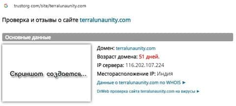 Проверка веб-сервиса аферистов TerraLUNA Unity на trustorg com показала, что возраст домена к моменту написания статьи составляет 51 день, скорее всего домен купленный.