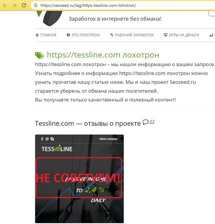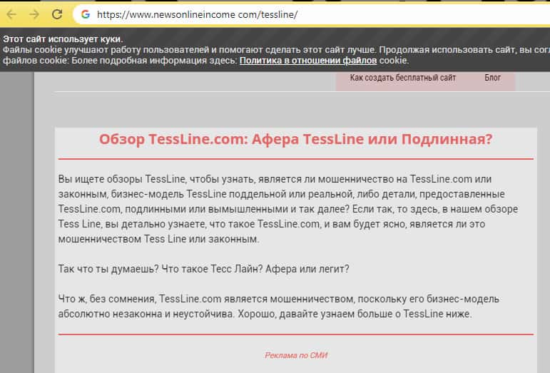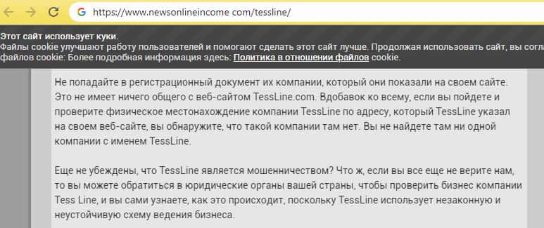 На сайте автор утверждает, что в лохотроне Тесс Лайн все подставные лица, рассказывают, что сами зарабатывают, вложили хорошие деньги и хорошо зарабатывают. Все бы да ничего, да только те, кто приглашают, не хотят камеры включат и показывать лицо, что было проверено лично автором отзыва.