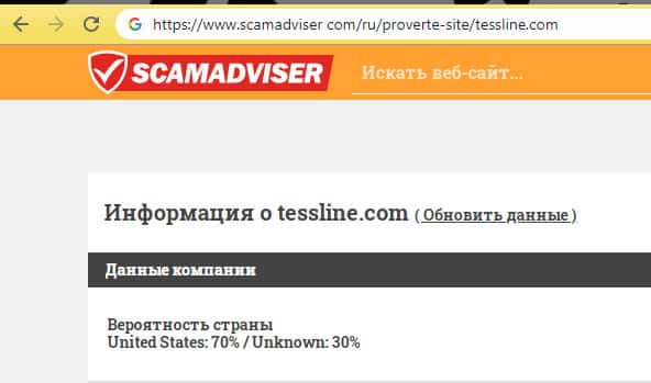 Дополнительную информацию мы попробовали найти на известном сайте-тестировщике, но как видно на изображении, расположенном ниже, толком никаких данных найдено не было. Подозрительно выглядит шарага TessLine, которая соскамилась так быстро, не оставив о себе данных даже о домене, с которого они кидали людей.