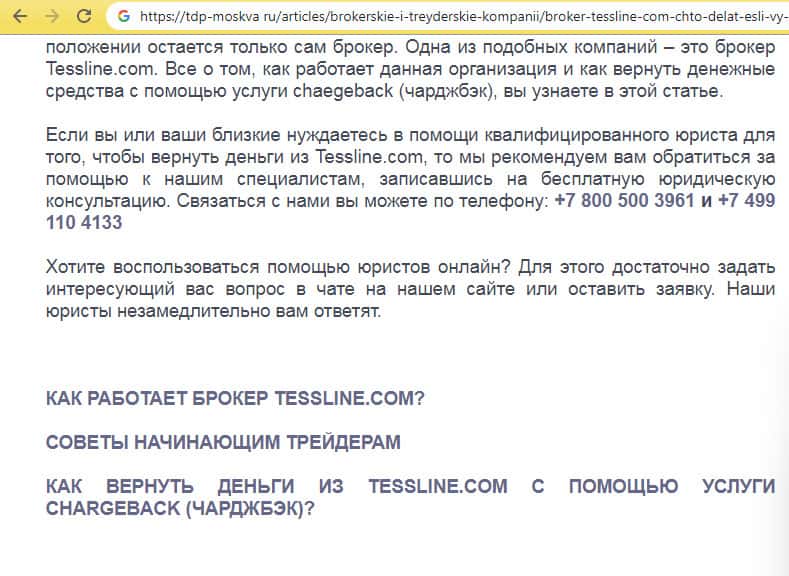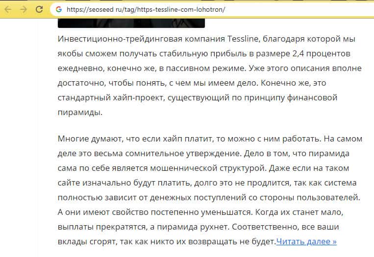 В статье, которую можно увидеть на изображении ниже, рассказывается о том, что все обещание конторы Тесс Лайн это все замануха и недобросовестные брокеры просто пытаются любыми словами выманить из клиентуры бабки, заставляя вкладывать средства во все подряд, даже не успев подумать о том, принесет ли это прибыль.
