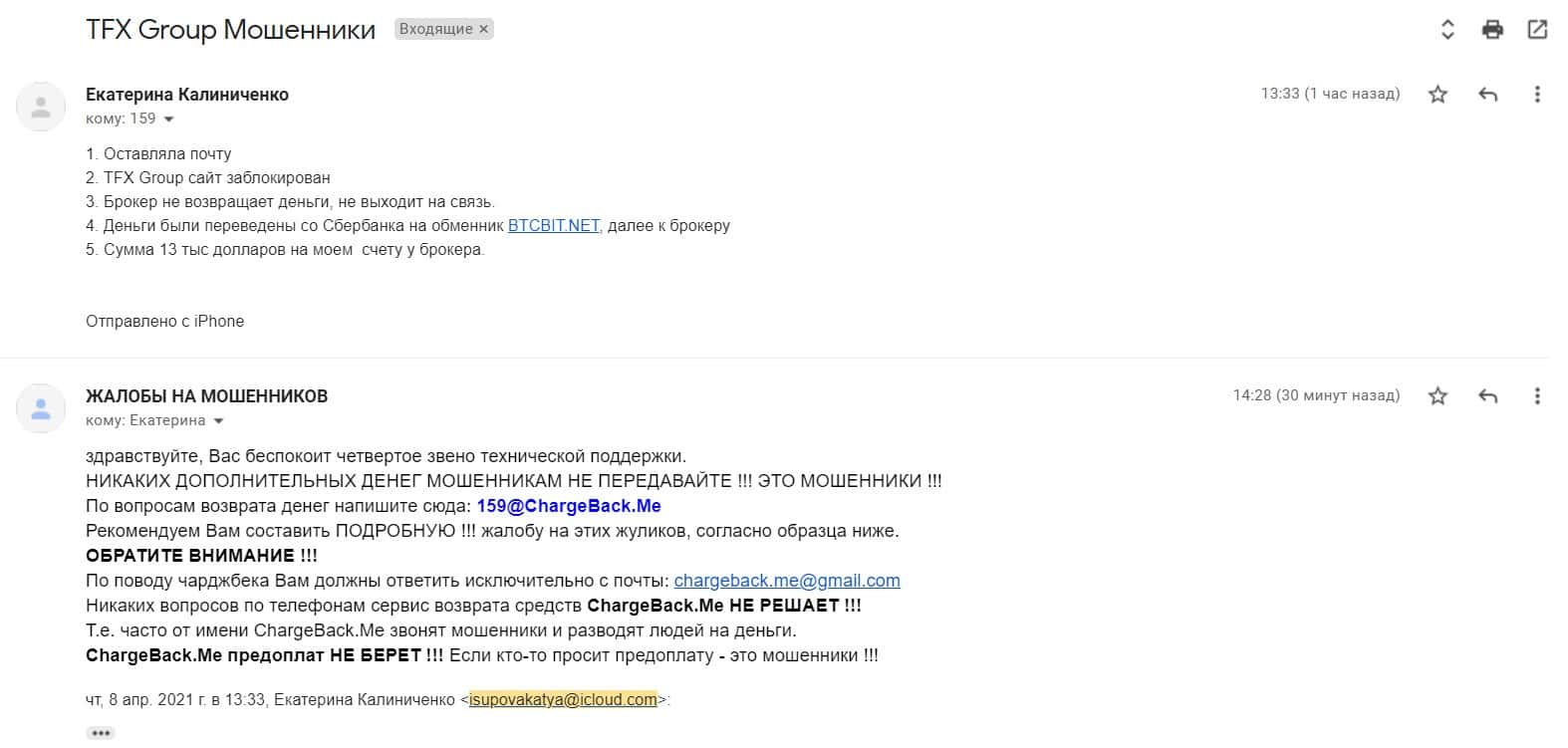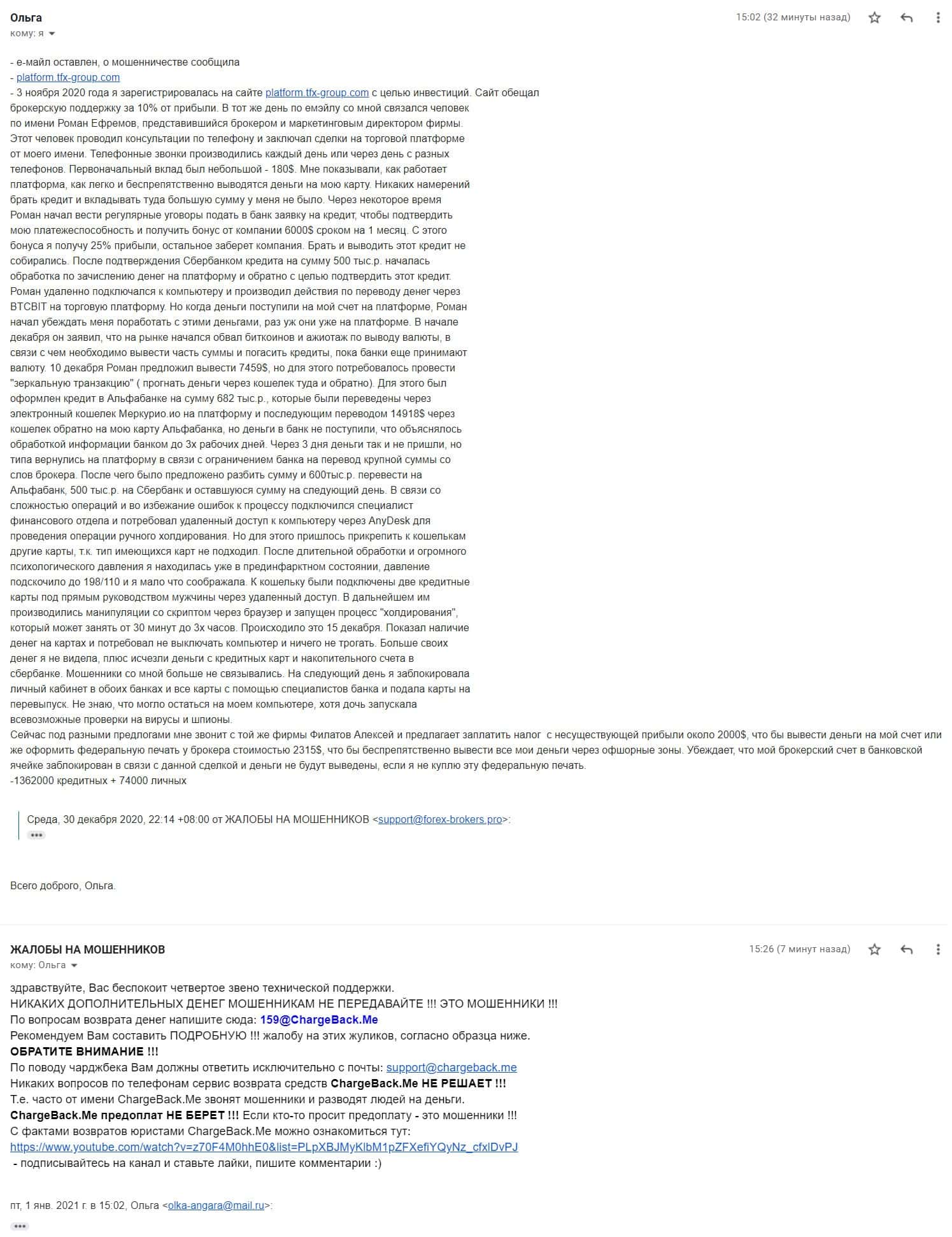 Далее предлагаем ознакомиться с жалобой от одной пострадавшей от деятельности конторы ТФХ Групп, которая развела клиентку на 13 000 долларов США.