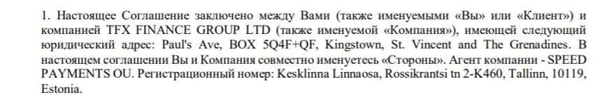 Юридическим лицом брокерской конторы ТФХ Групп являются организации: TFX FINANCE GROUP LTD и SPEED PAYMENTS OU - платежный агент, с регистрацией в Эстонии.