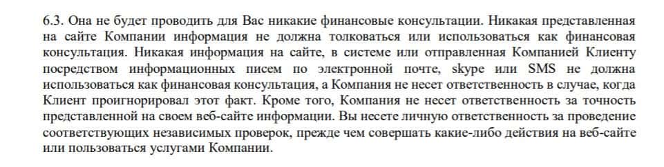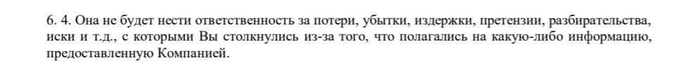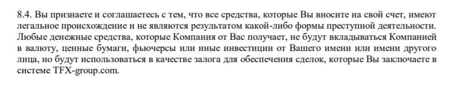 Следующий пункт договора гласит, что компания TFX Group будет отвечать за потери и убытки клиента, которые он понес из-за неточной информации, выложенной на сайте.