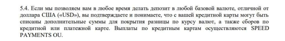 В пункте 5.4 договора компания TFX Group уведомляет клиента, что может списывать с его платежной карты сборы и различные комиссии за обслуживание и некоторые другие.