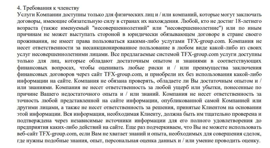В разделе 4 своего клиентского соглашения брокер TFX Group говорит, что не обязан проверять, обладает ли клиент достаточным опытом, чтобы торговать на их сайте.