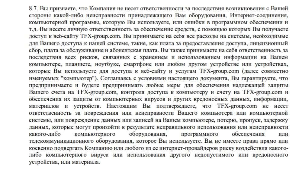 Пункт 8.7 договора компании TFX Group говорит о том, что брокер не несет ответственности за неисправность оборудования, технические сбои на сайте и убытки в результате этого.