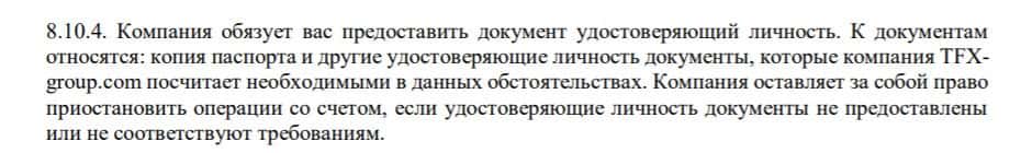Далее речь идет о том, что клиент обязан предоставить документы для прохождения верификации, которая является обязательной на сайте TFX Group.