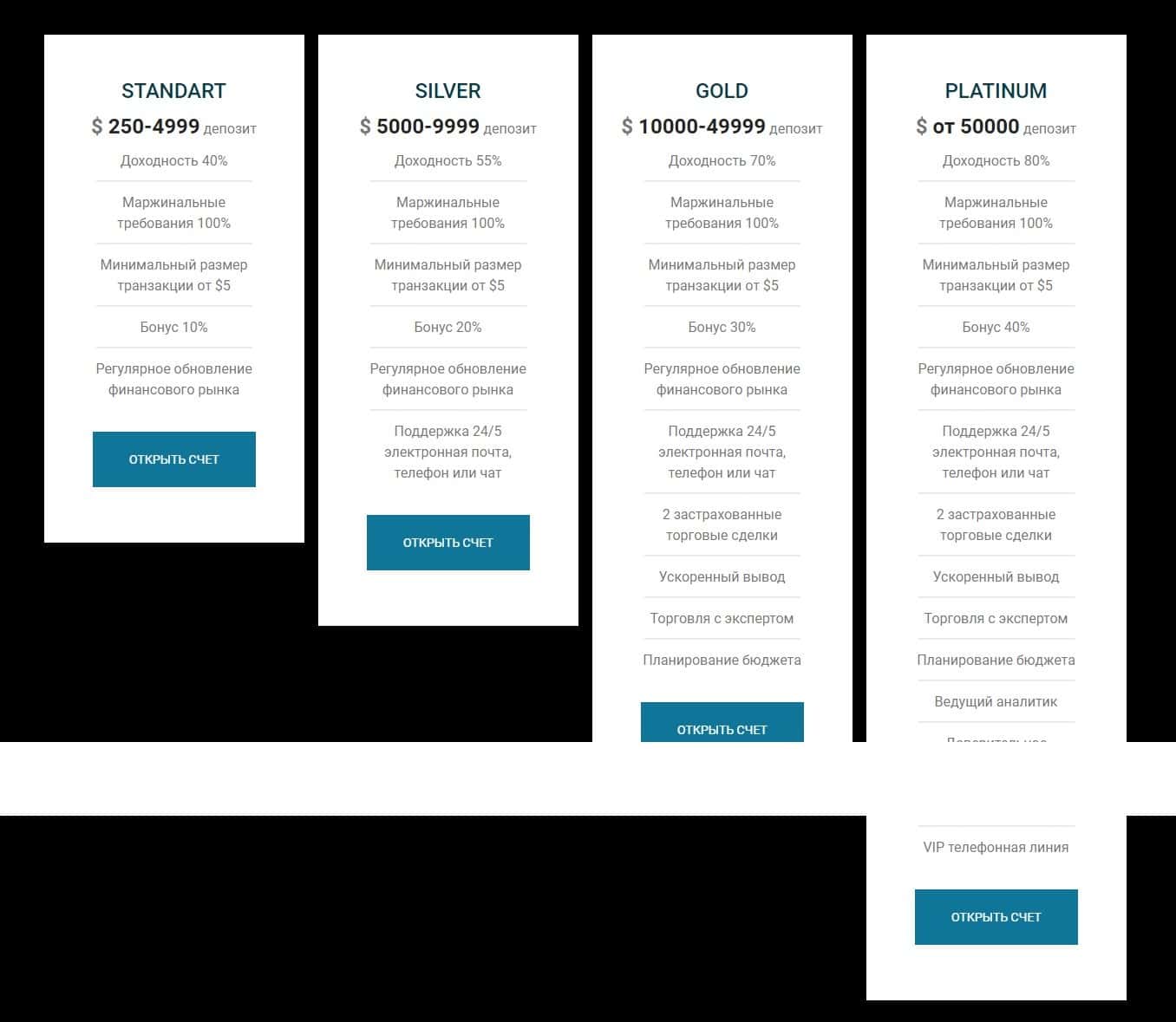 Тарифы с типами счетов на сайте брокера ТФХ Групп просто скопированы с сайтов других брокеров-мошенников, они фейковые и не отражают действительности.