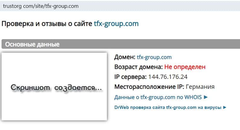 Кому принадлежит доменное имя сайта tfx-group com, выяснить нельзя, потому что мошенники скрыли информацию о владельце сайта.
